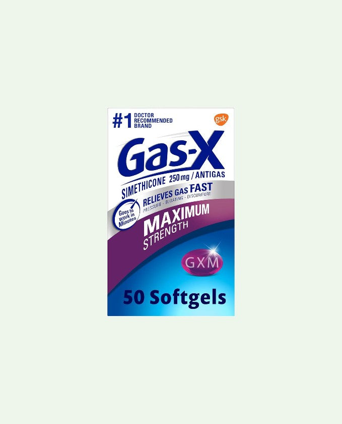 - One 50 ct package of Gas-X Maximum Strength Gas Relief Softgels with Simethicone 250 mg; number 1 Anti-Gas Relief